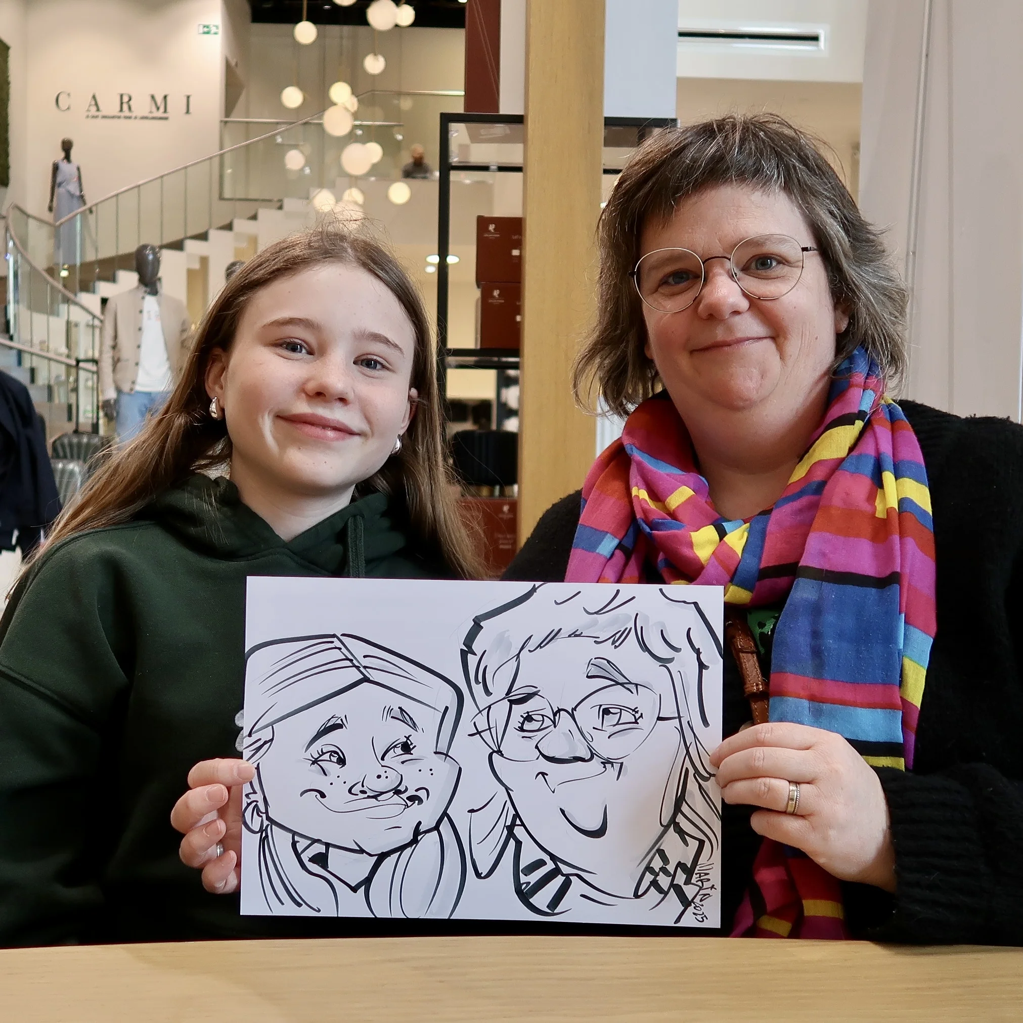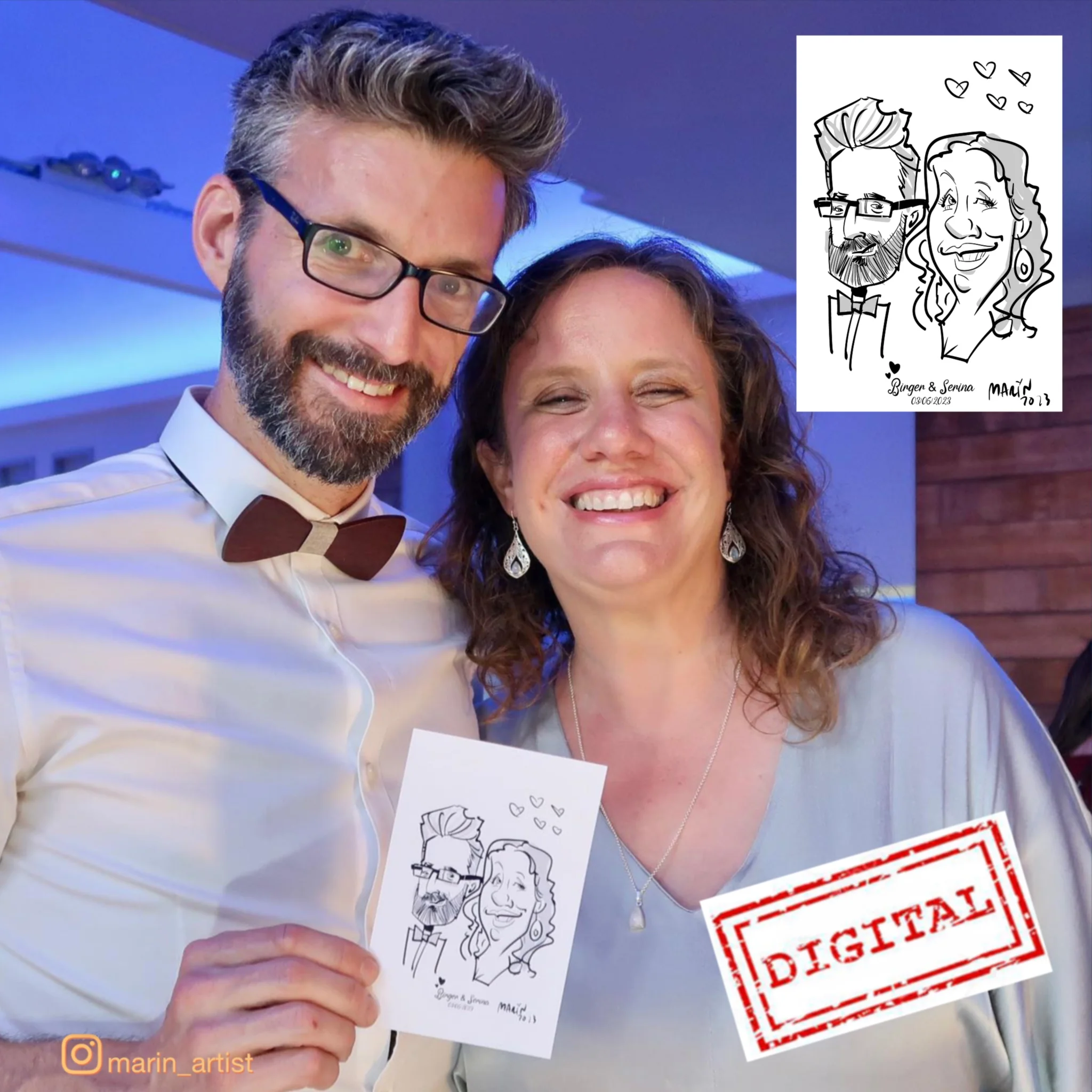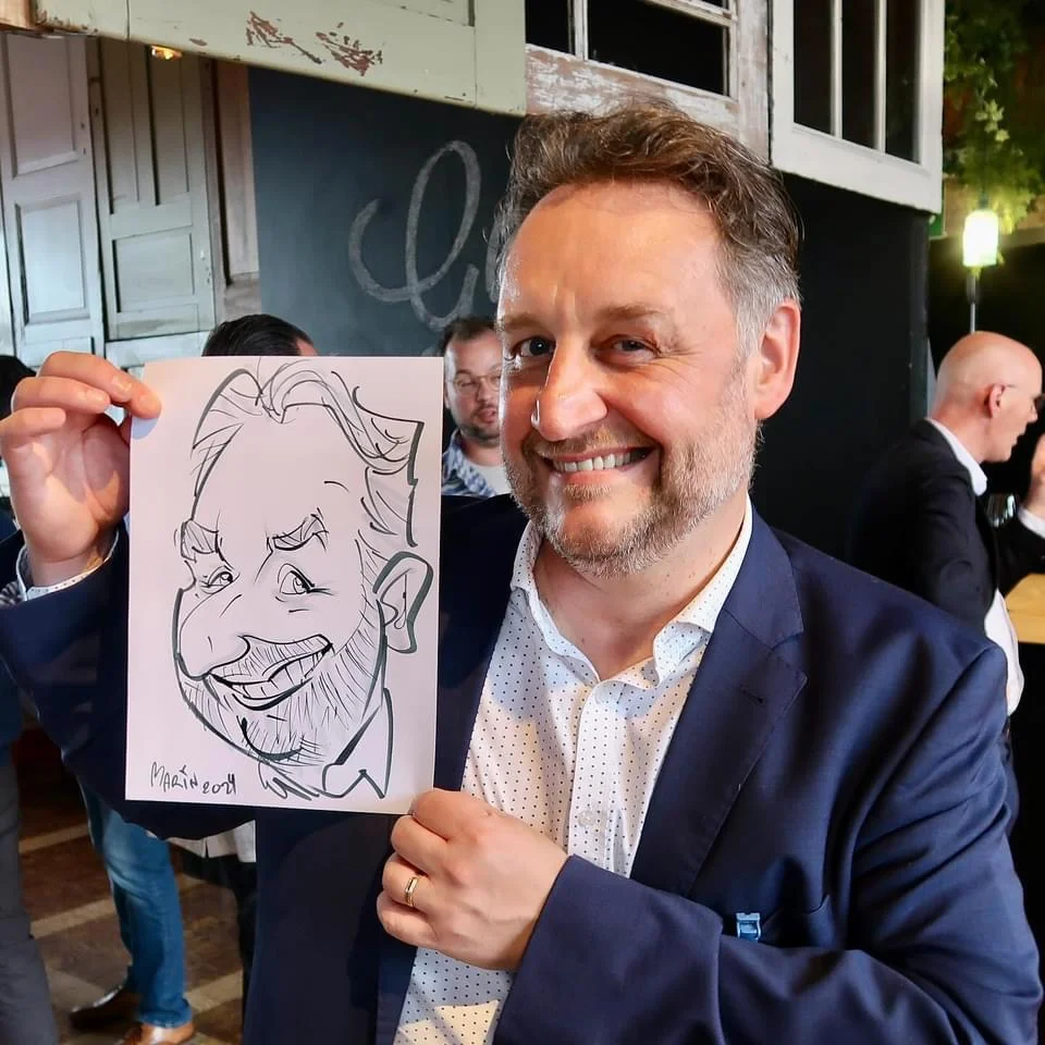 Ik teken ook digitale karikaturen op mijn iPad. Die druk ik af in postkaartformaat op het event zelf en verstuur ik je digitaal na het event.